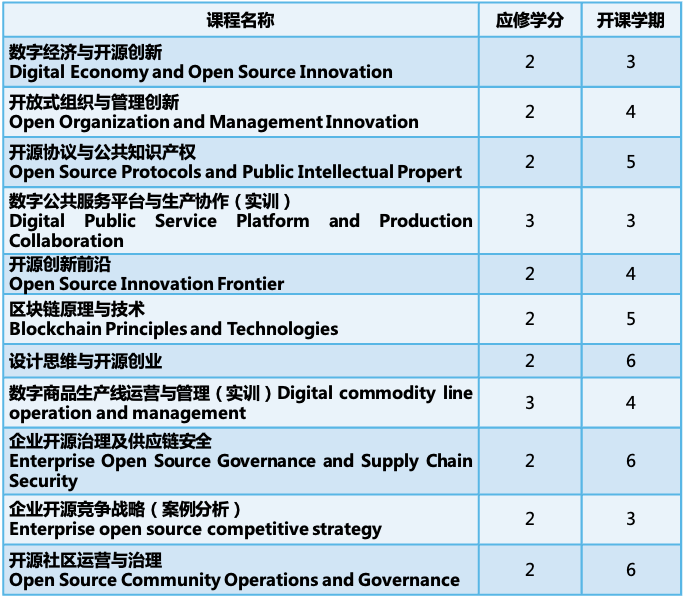 培养具有国际视野、数字思维及数字世界观,洞悉数字经济商务模式及运营规则,拥有开源创新理论及方法论,掌握数字商品大规模生产协作开源平台、技术、工具及能力,能从事企业开源竞争战略规划、开源治理、开源社区运营且知行合一的开源创新人才。