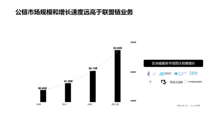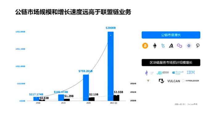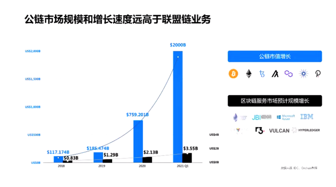 在面对企业的区块链的规模和整个公有链上的加密资产进行比较,实际上小巫见大巫的一种状态,在整个公有链的市场里面,所有的加密资产加起来达到了2万亿美金的一种规模。其实整个公链市场是一个比企业服务市场要大,大概几百倍的一个市场。