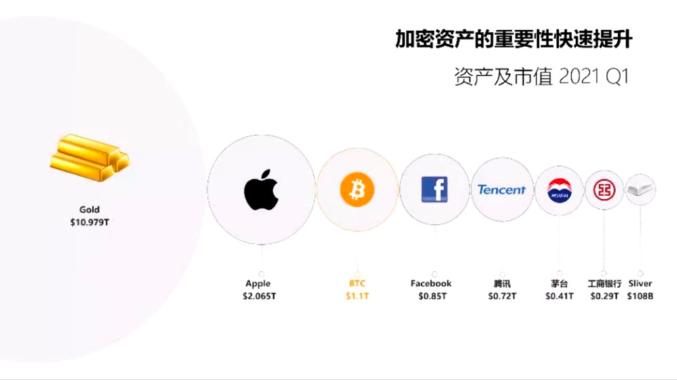 为了更加清晰地了解2万亿美金的规模,我们可以看一下对比图,作为比特币,一种单一的一种加密资产,体量在1.1万亿美金,与之相比,黄金在大约11万亿美金,比特币的体量大约是黄金的十分之一,本文认为在未来若干年比特币是一个比黄金更加优秀的一种价值存储的媒体,所以我个人觉得有可能它会超越黄金的市值。相比较而言,苹果的市值在2万亿美元左右,相当于两个比特币的市值,Facebook在0.85万亿美元,腾讯0.7,和Facebook差不多,而中国最大的资产茅台在0.4万亿,工商银行则在0.29万亿。
