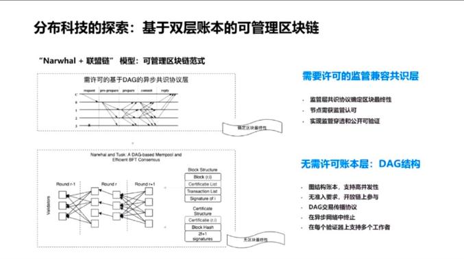 对于可管理区块链的实现,我们的研究人员最近在论文中找到了一些可行的方向。其中一个可行的方向是Facebook主导的Libra项目,其发表的一篇论文——《Narwal and Tusk》 ,介绍了一种新型的共识,这个新型共识分成两层,第一层有一个DAG,是一个树状的结构,形成最初的候选的第一层账本,而第二层是一个共识的小组,这一层对候选的账本进行最终的落账。通过这样的两层共识机制,区块链就可能实现可管理,可以做到前文所述的五点:可审查、可编辑、可授权、可治理和可审计。