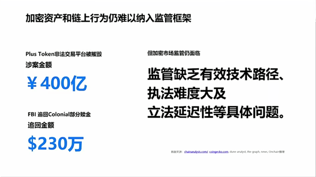 而在中国,2020年破获了一起类似于传销的案件——Plus Token,涉案金额在400万亿人民币左右。最终司法挽回了230万亿人民币。虽然挽回了一部分金额,但加密市场监管仍面临监管缺乏有效技术路径、执法难度大及立法延迟性等具体问题。