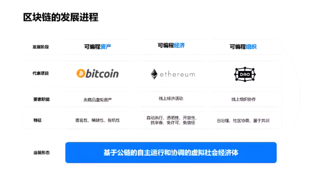 所以在最早期,也就是09年到13年期间,区块链的发展是一种可编程的资产,这个时候集中在资产,而第二个阶段在14年之后,出现了像以太坊这样的新型的智能合约平台,即可编程的经济。第三阶段则是从近几年或开始的,为了对这些平台和虚拟经济体进行治理,出现的可编程的组织。
