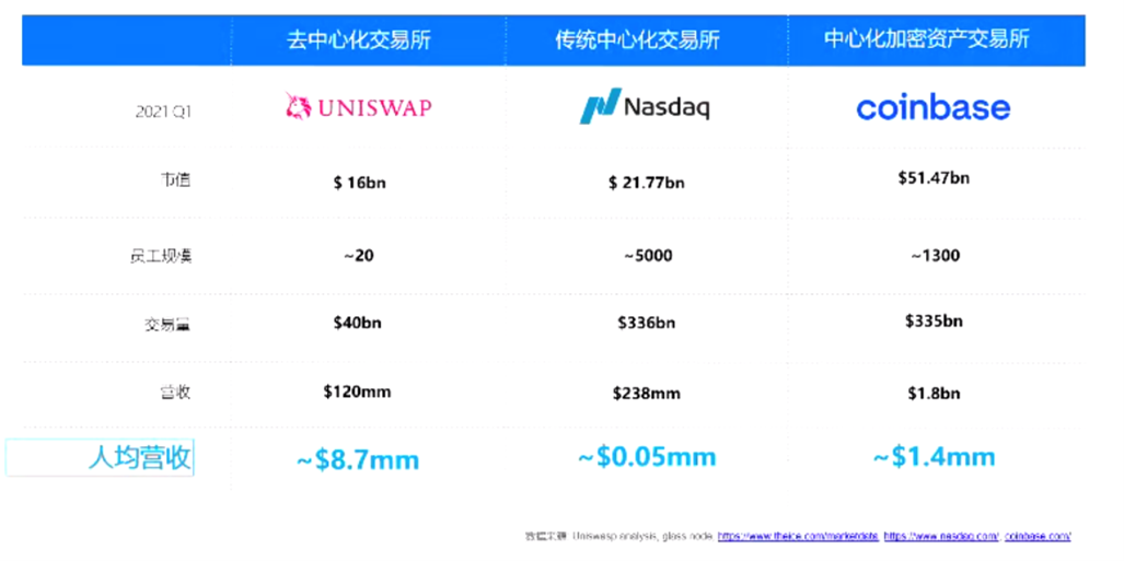 除了加密的资产,公链的相关服务也表现出很强的、很高的效率。比如,如下的三个交易类的主体,Uniswap——完全由程序来运行的一个交易所,一个去中心化的交易所,只有不到20个员工。纳斯达克——大约有5000个员工,Coinbase则是一个去中心化的交易所,在纳斯达克上市的一个交易比特币等数字资产的一个交易所。三个交易所比较,Coinbase是一个比纳斯达克还要大的交易所,他比纳斯达克更加赚钱的一个机构。而就单个员工个人效率来看,Uniswap是完全去中心化的、程序化的交易所,远远超过了纳斯达克和Coinbase的人均营收。所以,我们可以明显看得出,在效率这一块,去中心化的、完全程序化执行的一些应用,是高度有效的。