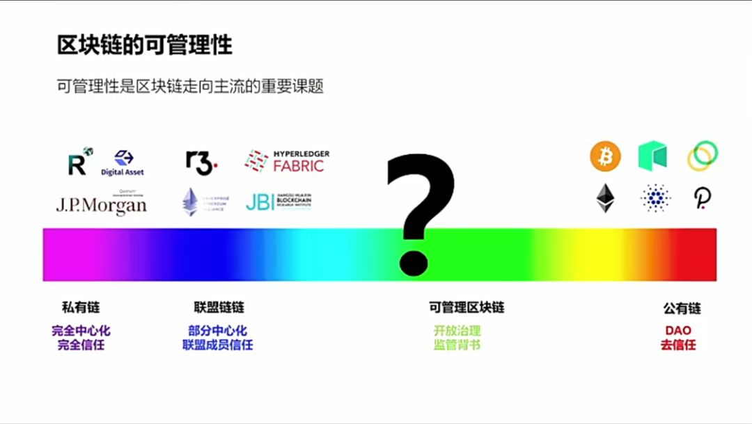 正由于公链有很强大的生命力但同时又具有很强的局限性,所以我也在思考如何在两者之间找到一个平衡点,在光谱上找到一个自己的落脚点,如何做一个既开放又能够有很强的活力又有很低的准入门槛的一种可管理的区块链,也就是在图上的绿色部分。可管理性是区块链走向主流的重要课题。