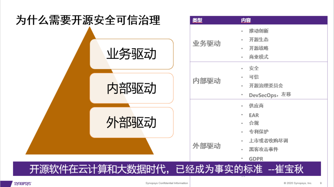 开源已经占据了整个软件领域非常重要的一个位置,那么在这样的一个前提下,从治理层面来看,我们需要从外部的驱动,转变为内部驱动,最终变成业务的驱动。在外部驱动方面,比如与供应商合作的时候,需要提供一个供应清单,说明你提供给我的这个软件里有哪些开源的组件、有哪些许可证;有些公司要上市或收购的话,针对软件这一块儿有一个尽职调查,尤其是针对软件资产,针对开源有一个追溯;还有最近个人的一个GDPR,那么从外部来看,有很多因素会推动我们去做。