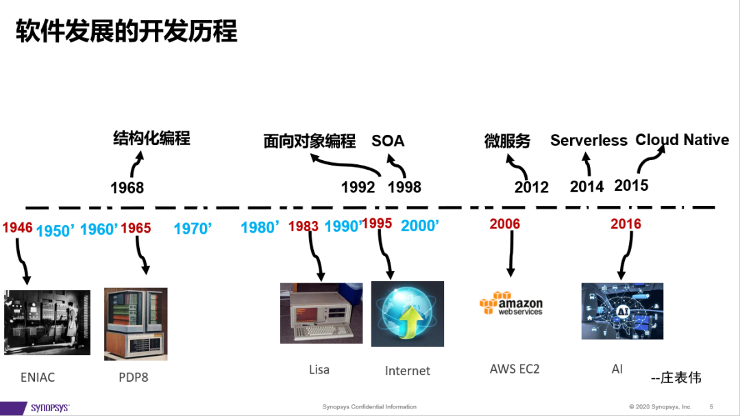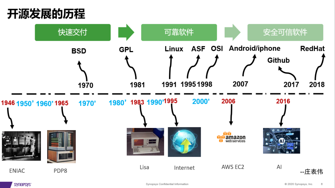 首先通过时间轴,我们简单回顾了软件发展的开发历程,以及开源发展的历程。在最近的几十年里,软件的多样性逐步增加,变革越来越快。随着开源的发展,「可信」变得愈发重要,再者,最近两年的商业化变革,包括GitHub被微软收购、RedHat被IBM收购,开源进入到一个全新的领域,很多公司都在拥抱开源。从开源的历史视角来看,可能一开始追求的是快速的交付,后来是需要一个可靠的软件,那现在我们需要的是一个安全可信的软件。