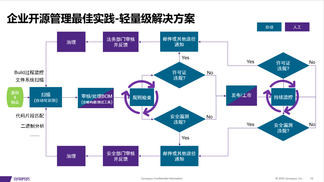 针对轻量级的解决方案,首先,通过工具扫描得出一个基础数据,如果发现某个开源组件有高风险,请开发同事来做确认。再者,要做规则检查。另外,从合规的层面来讲,需要法务部门的参与,因为法务与专利、知识产权的关系很密切。在产品上线后,还需要对许可证违规和安全漏洞做持续的监控。对于许可证来说,根据产品型态的不同也需要有所改变,比如当一个产品从内部开源变为外部分销时,许可证的等级会提高 ,这时我们需要关注许可证合规的风险。