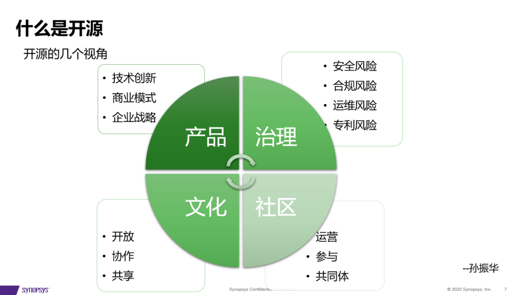 我们可以从产品、治理、文化和社区四个视角来看开源。产品层面上,越来越多的公司参与到开源里,那么有些公司是以开源作为一个技术的创新,或者打造自己的一个生态,或者作为企业的战略来推动;有些公司可能是作为一个使用者参与到开源治理中。治理层面上,我们要考虑到开源软件的安全、合规、运维和专利风险。社区层面上,有主体的运营,还有参与,打造一个共同体。现在在国内,我们能看到很多开源的同仁一直在鼓励或参与社区的交互,这一点非常重要,无论是对于开源的使用者还是输入方,都会形成一个比较好的良性互动。文化层面上,从企业的角度、个人的角度,我们都希望通过开源的一个方式,可以打造一个开放、协作和共享的这样一个文化氛围。