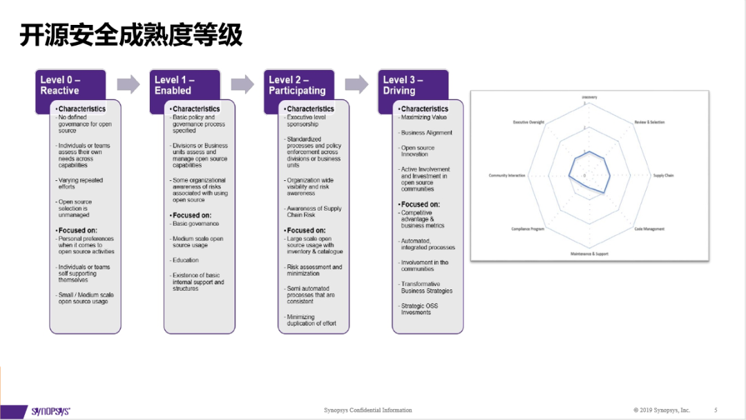 开源安全成熟度等级可分为0、1、2、3。第一个等级是Reactive,基本上处于一个无序的状态,也没有什么规范,主要是无组织或者以个人、小组的形式在进行;第二个等级是Enabled,有些组织有一些基本的规范,有意识到开源可能遇到的各种风险,需要去关注。在关注的基础上,有一些基本的治理、培训,有支持的团队;第三个等级是Participating,管理层开始支持标准化的流程和规范,关注开源的透明度和风险,对于公司在使用的开源组件给出指导性的一些规范,有专门的组织或者团队来维护一些特定的组件,最大限度地减少重复性的工作。最后一个等级是Driving,把开源作为公司的一个战略,包括技术创新、打造商业模式和生态。