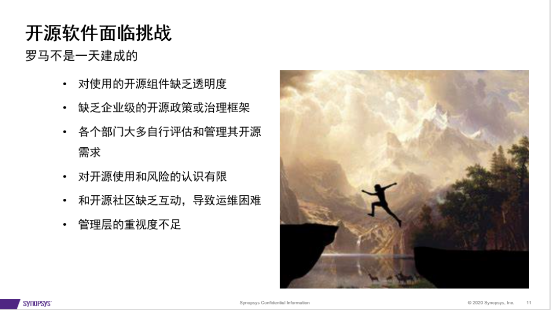 在使用开源的时候,也有很多的挑战。首先,我们看到很多的公司,对使用的开源组件缺乏透明度,不了解公司里使用开源的情况。第二,缺乏企业级的开源政策或治理框架。第三,各个部门大多自行评估和管理其开源需求,但很少真正形成系统化,需要更多的重视。第四,我们在使用开源的时候,对于风险的认知是有限的。现在越来越多的公司走向海外,那很多原先可能没有意识到的问题摆在了我们面前,比如合规的风险、知识产权的问题等等,愈发突显。还有就是和开源社区缺乏互动,这导致运维非常困难。最后,希望管理层能足够重视开源,推动开源治理往前走的步伐。