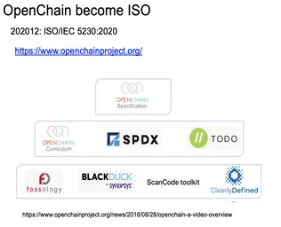 为了应对开源供应链上下游的管理挑战,Linux基金会下的OpenChain项目于2020年21月16日发布了基于OpenChain2.1的ISO5230开源供应链的国际标准,OpenChain项目维护了开源许可证遵从性的国际标准。这使得所有规模和行业的公司都能够采用高质量的开源合规计划的关键要求。这是一个开放的标准。