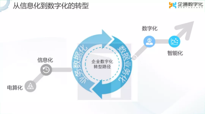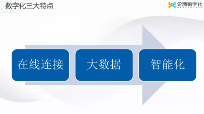 那数字化有什么特点呢?第一,在线连接。以前的系统不是实时在线的,现在的系统都要求实时在线。越来越多的系统都放到云上,能做到时时在线,让业务永不停顿。第二,大数据。要把更多的系统连接在一起,要把一个企业的大数据的价值发挥出来,最终来形成智能化。