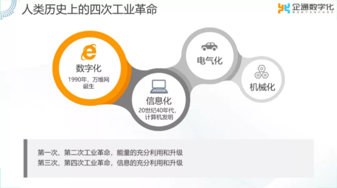 人类历史上的四次工业革命。第一次工业革命:机械化。第二次工业革命:电气化。第三次工业革命:信息化。这个是我们比较熟悉的,从上世纪40年代有了计算机的发明和出现,给我们带来了信息化的革命。今天我们正在经历的是第四次革命,也就是数字化的革命。