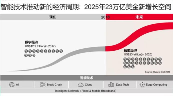 我们来看一下数字化技术。智能技术推动新的经济周期,到2025年由23万亿美金的新增长空间,就是基于“ABCDE”,即AI(人工智能)、Block Chain(区块链)、Cloud(云计算)、Data Tech(数据技术)、Edge Computing(边缘计算)。当然,开源技术也在其中,渗透到每一个领域,其实每一个技术领域里都有开源技术的存在。所以这个适用范围也非常大,我们看到这样巨大的一个机会是前无仅有的。