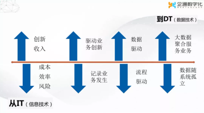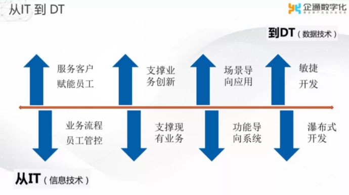 数字化的这些特点,从IT的角度来分析,我们说现在是从信息化迈向数字化,从IT(信息技术)迈向DT(数据技术),或者说,有哪些方面的不同与扩展?其实就是信息化的一个升级和放大。相当于说,今天我们用智能机,我们仍然可以像以前非智能机那样打电话、可以发短信,但其实它的本质已经改变了,它不只是能打电话发短信,上面有各种各样的应用,它成为了一个计算设备。这个是从IT到DT发生的变化。原先IT时代,我们做的一些应用和系统,重点是帮助企业做业务流程的固化和员工的管控,让大家跟着这个软件来走,以免出错。但是今天,在这个数字化时代,我们更多的是强调如何去服务客户、赋能员工。这个才是做数字化、使用数字化系统的目的。