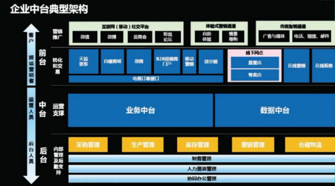 那这么多系统,怎么把它们之间的数据打通呢?下面给大家分享一下现在数字化实践的架构之一:数字中台。未来企业面临着多系统的情况,他要想打破各个系统之间的数据孤岛,把各个系统都集成起来,一定需要这样的大数据能力。
