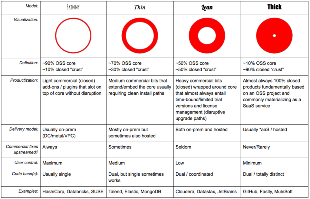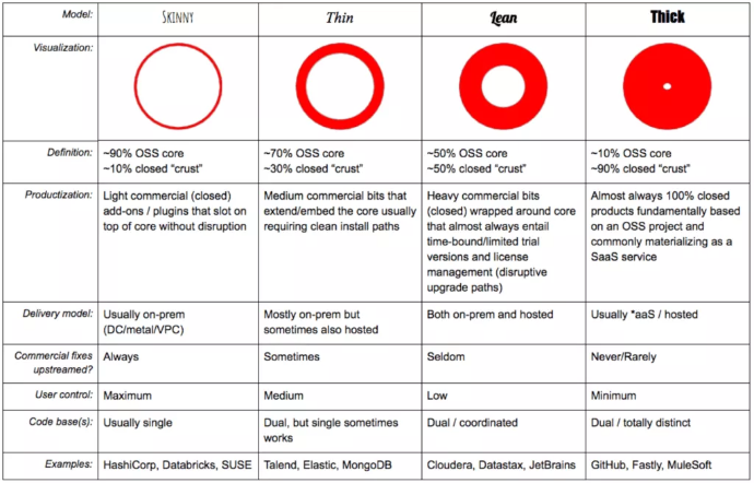 值得注意的是,“开放核心”模式也存在不同的“开放性”变体。开放核心组织可以根据其公司战略和商业利益,选择开放程度的高低。如何在私有和开源之间取得平衡是开放核心模式的最大挑战。