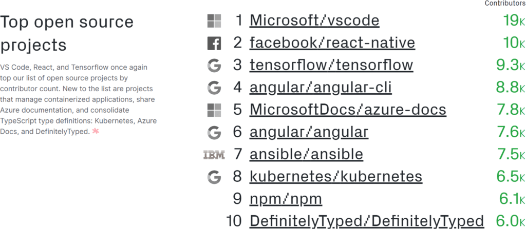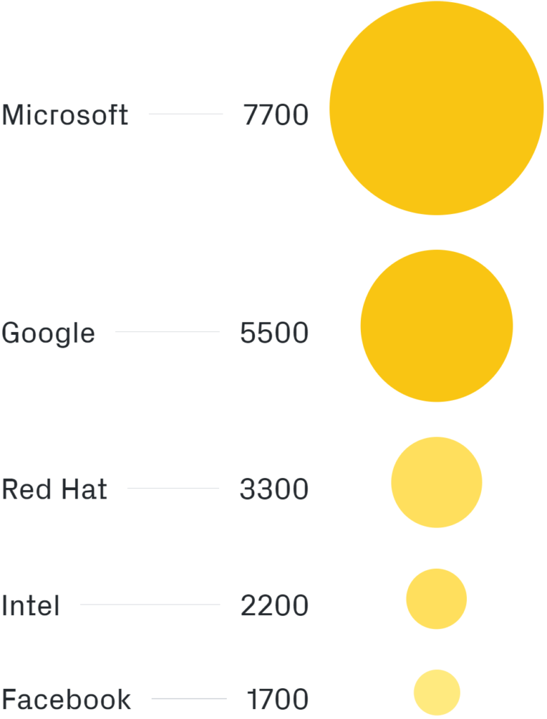 微软、谷歌、英特尔和Facebook,它们都不是开源公司,但都在GitHub上积极参与各种项目。2018年,微软员工是GitHub最多产的贡献者,大约有7700名独立贡献者(2017年总计有4550名贡献者)。