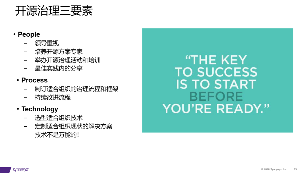 这是为什么要引入“人”这一要素的第一个原因。第二个原因是,最终的开源风险的管理都是基于我们的业务驱动。没有任何一个工具或者技术是懂业务的,只有 “人”才懂业务。所以我们的技术,我们的流程都是“人”来定义,没有这个“人”,这个技术再好也发挥不了效力。而流程需要根据业务需要不停地去改善和变化。总结来说,人、流程和技术这三要素是缺一不可的。