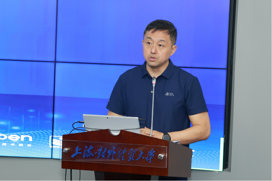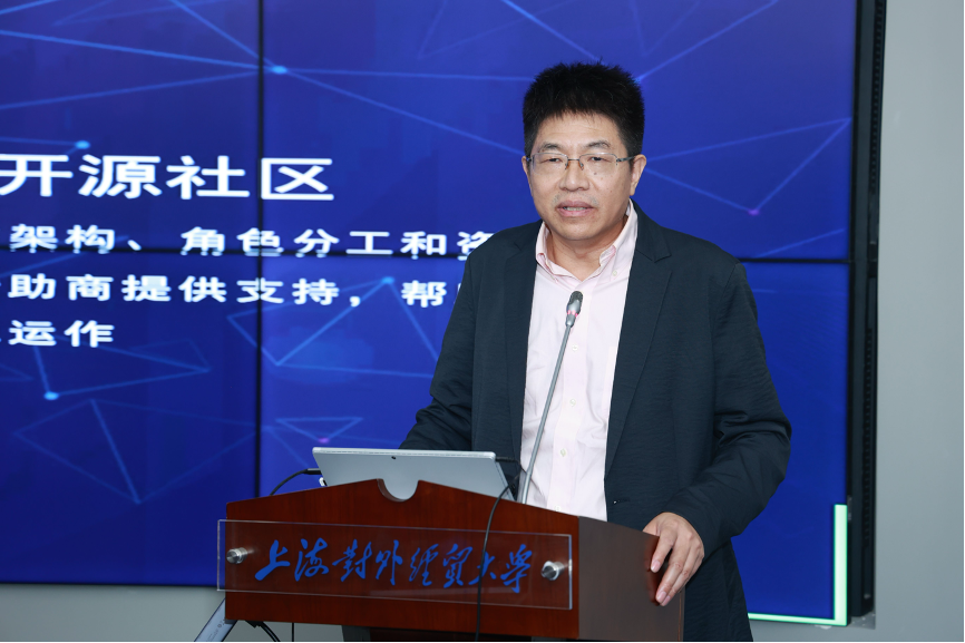 上海对外经贸大学党委副书记、纪委书记章益国教授在开幕式上致辞。上海对外经贸大学自建校之日起,一直承担着国家对外开放的历史重任。在香港基本法起草、中国“复关”“入世”谈判、浦东开发开放、临港新片区制度型开放、“进博会”和上海国际贸易中心能级提升等方面做出突出贡献。上海对外经贸大学也被誉为“中国对外经贸人才的摇篮”。上海对外经贸大学在开源方面布局较早,2013年就开始了开源理论研究及开源人才培养工作,多项专报获得了国家及上海市领导批示。学校2023年开设了开源创新与数字治理微专业,共11门课,采用开源共建模式。为进一步落实国家战略,上海对外经贸大学于今年8月份成立了开源创新与数字治理研究院,一是支持国家及上海市开源创新战略,并做好理论、政策和人才准备;二是以开源为抓手,推动相关学科专业建设。