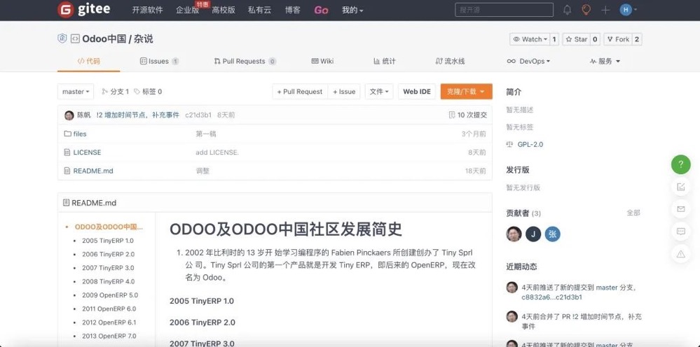 上海开源信息技术协会在前期通过初步征集与汇总,形成了初稿,并上传至Gitee(如图)。目前所收录事记尚不完善,现邀请Odoo社区的各位参与者共同参与补充编写。