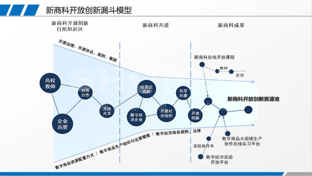 新商科是针对现有商科课程体系、人才培养模式不能适应数字经济发展需要,而现有商科院校难以独自完成自我教育革命的现状而提出来的一个概念。新商科不是在现有课程体系、人才培养模式下运用数字技术而进行的修修补补,而是基于社会需求,在新的教育理念指导下,按照数字经济基本规律,重新构建课程体系、人才培养模式、教学模式、管理体制的过程。