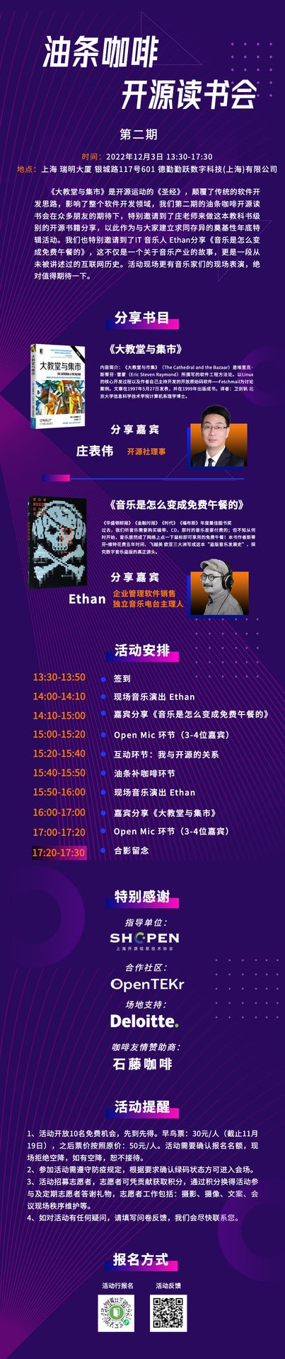 《大教堂与集市》是开源运动的《圣经》,颠覆了传统的软件开发思路,影响了整个软件开发领域,我们第二期的油条咖啡读书会在众多朋友的期待下,特别邀请到了庄表伟老师来做这本教科书级别的开源书籍分享,以此作为与大家建立求同存异的奠基性年底特辑活动。我们也特别邀请到了 IT 音乐人 Ethan 分享《音乐是怎么变成免费午餐的》,这不仅是一个关于音乐产业的故事,更是一段从未被讲述过的互联网历史。活动现场更有音乐家们的现场表演,绝对值得期待。